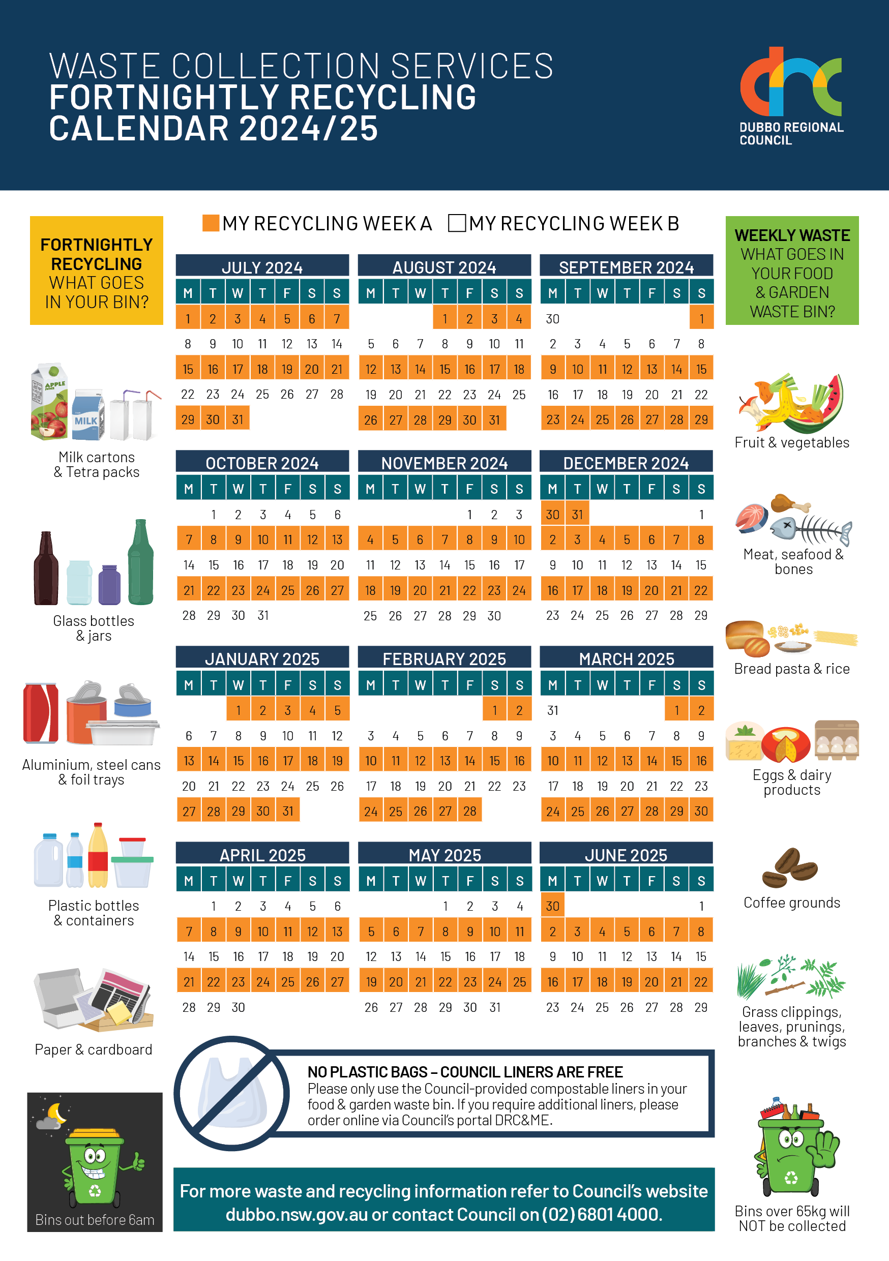 The Dubbo Regional Council collects rubbish weekly early on Friday mornings, red bins weekly and yellow bins two weekly. The website should give our recycling week but doesn't appear to have heard of either Alexandrina Avenue or Fountain Circuit - but we are recycling week A..